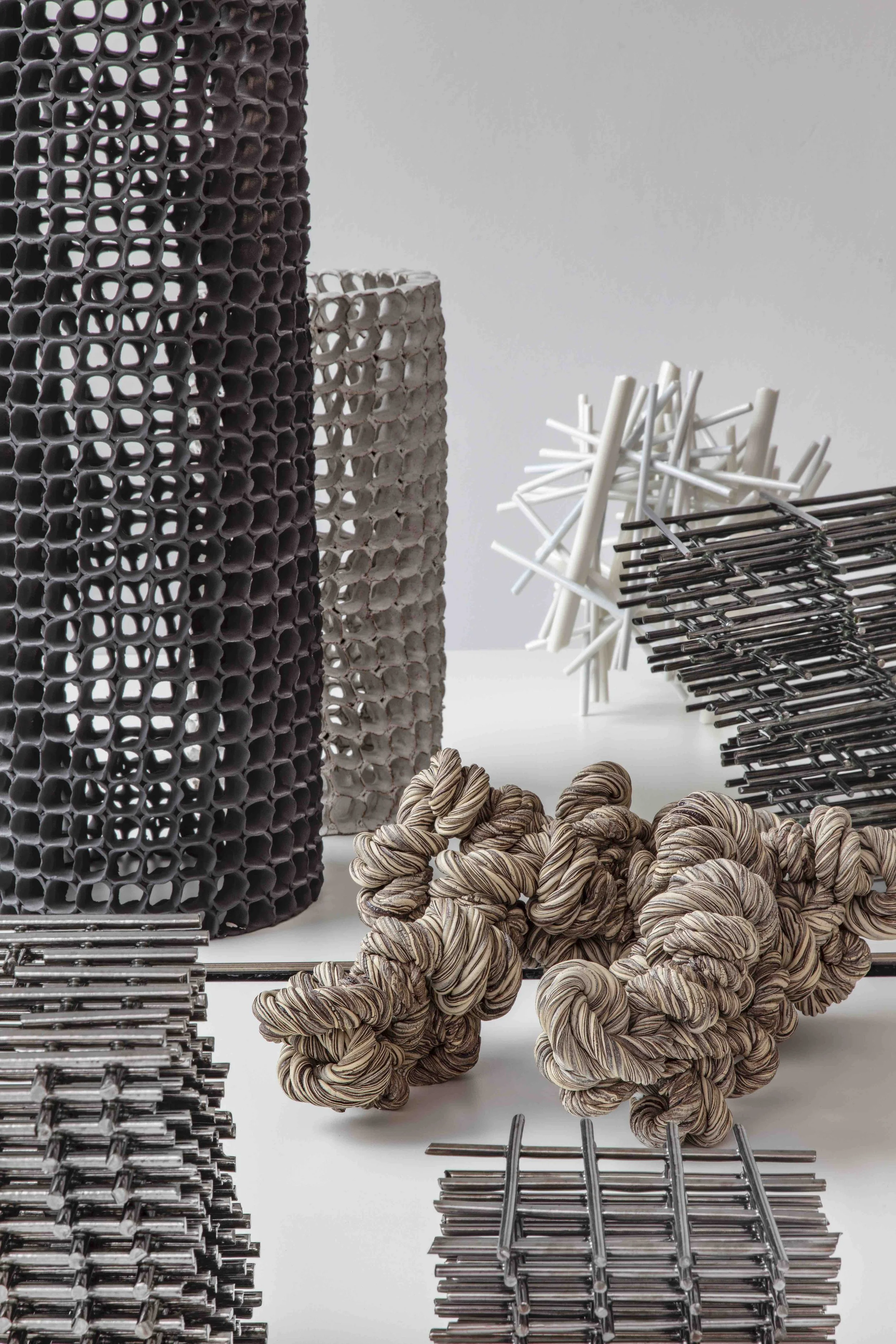 “Derfor præmierer udvalget ”Infrastructure” “Infrastructure”er titlen på den fællesudstillingaf de tre keramikere Lea Mi Engholm, Stine Jespersen og Mikael Jackson, som med præcision og kontrol, samt mod til at overgive sig til tilsyneladende tilfældigheder, brænder igennem med personlige og særegne udtryk. Alle tre arbejder med en dogmatisk tilgang hvor hvidt forskellige teknikker er i centrum, men som hver især sætter deres tydelige præg på de endelige værker. Lea Mi Engholm snor leret til det næsten ikke kan mere –de tynde snore snor sig selv og hinanden til fine snoede formationer. Stine Jespersen udfordre gentagelsen i sine symmetriske åbne figurer. Mikael Jackson stabler tynde ler stænger i udfordrende konstruktioner –som mere ligner stål end ler. På trods af de forskellige teknikker ses en tydelig rød tråd gennem hele udstillingen som forbinder de abstrakte værker i form af rytme, moduler, gentagelser, pauser/ undtagelser -eller kort sagt orden v.s.kaos At beskrive dette allestedsnærværende tema så præcist og delikat,og tilmed med et medie-ler-som de fleste af os går på,uden at skænke nogen nærmere opmærksomhed, på så beskedent et areal som det lille udstillingslokale muliggør , er en præstation. Det åbner publikums øjne for lerets muligheder -for at undersøge, udforske, udtrykke og kommunikere”